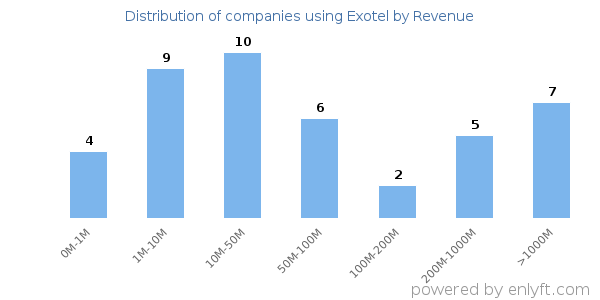 We have data on 44 companies that use Exotel. The companies using Exotel are most often found in India and in the Computer Software industry. Exotel is most often used by companies with 50-200 employees and 10M-50M dollars in revenue. Our data for Exotel usage goes back as far as 8 years and 3 months.