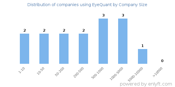 We have data on 15 companies that use EyeQuant. The companies using EyeQuant are most often found in United States and in the Marketing and Advertising industry. EyeQuant is most often used by companies with 1000-5000 employees and 200M-1000M dollars in revenue. Our data for EyeQuant usage goes back as far as 2 years and 7 months.