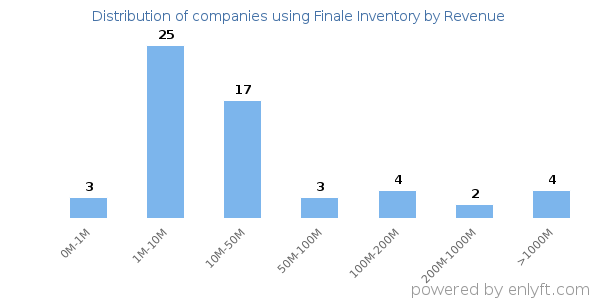 We have data on 62 companies that use Finale Inventory. The companies using Finale Inventory are most often found in United States and in the Retail industry. Finale Inventory is most often used by companies with 10-50 employees and 1M-10M dollars in revenue. Our data for Finale Inventory usage goes back as far as 8 years and 6 months.