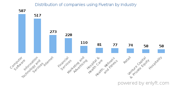 We have data on 3,401 companies that use Fivetran. The companies using Fivetran are most often found in United States and in the Computer Software industry. Fivetran is most often used by companies with 50-200 employees and 10M-50M dollars in revenue. Our data for Fivetran usage goes back as far as 5 years and 8 months.