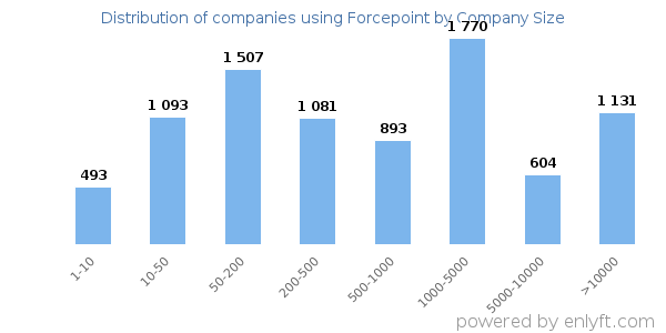 We have data on 8,718 companies that use Forcepoint. The companies using Forcepoint are most often found in United States and in the Information Technology and Services industry. Forcepoint is most often used by companies with 1000-5000 employees and >1000M dollars in revenue. Our data for Forcepoint usage goes back as far as 8 years and 6 months.