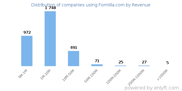 Of all the customers that are using Formilla.com, a majority (82%) are small (<$50M), 0% are large (>$1000M) and 6% are medium-sized.