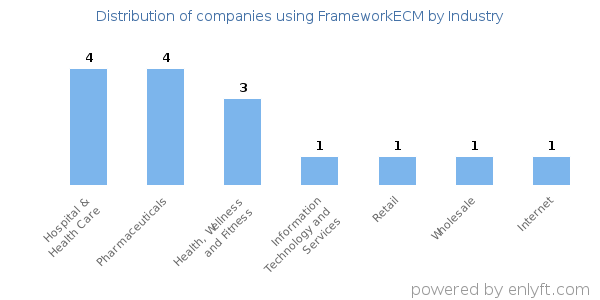 Looking at FrameworkECM customers by industry, we find that Hospital & Health Care (21%), Pharmaceuticals (21%) and Health, Wellness and Fitness (14%) are the largest segments.