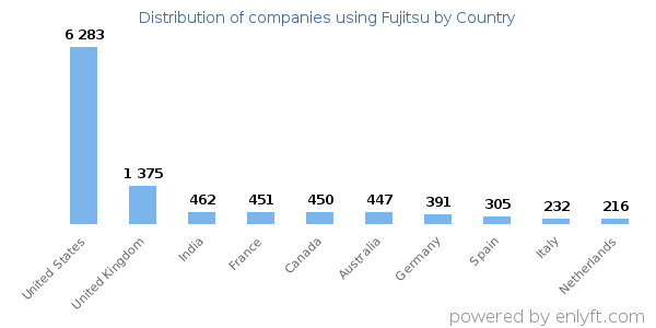 We have data on 13,635 companies that use Fujitsu. The companies using Fujitsu are most often found in United States and in the Information Technology and Services industry. Fujitsu is most often used by companies with 50-200 employees and 1M-10M dollars in revenue. Our data for Fujitsu usage goes back as far as 10 years and 1 months.