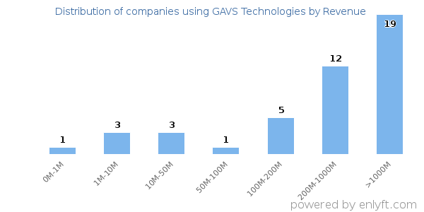 We have data on 46 companies that use GAVS Technologies. The companies using GAVS Technologies are most often found in United States and in the Information Technology and Services industry. GAVS Technologies is most often used by companies with >10000 employees and >1000M dollars in revenue. Our data for GAVS Technologies usage goes back as far as 8 years and 5 months.
