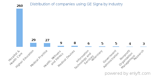 We have data on 397 companies that use GE Signa. The companies using GE Signa are most often found in United States and in the Hospital & Health Care industry. GE Signa is most often used by companies with 1000-5000 employees and >1000M dollars in revenue. Our data for GE Signa usage goes back as far as 9 years and 10 months.