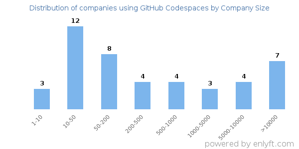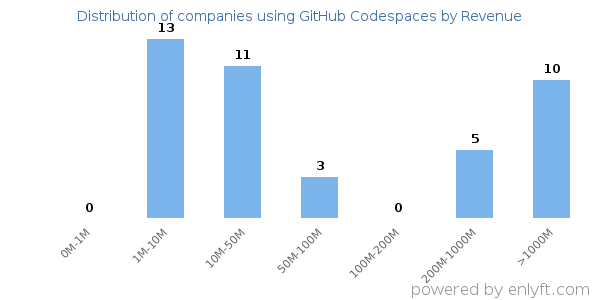 We have data on 45 companies that use GitHub Codespaces. The companies using GitHub Codespaces are most often found in United States and in the Internet industry. GitHub Codespaces is most often used by companies with 10-50 employees and 1M-10M dollars in revenue. Our data for GitHub Codespaces usage goes back as far as 2 years and 9 months.