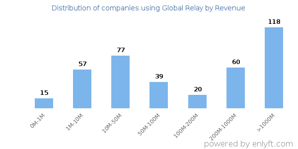 We have data on 399 companies that use Global Relay. The companies using Global Relay are most often found in United States and in the Financial Services industry. Global Relay is most often used by companies with 1000-5000 employees and >1000M dollars in revenue. Our data for Global Relay usage goes back as far as 8 years and 6 months.