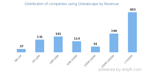 Of all the customers that are using Globalscape, a majority (53%) are large (>$1000M), 27% are small (<$50M) and 16% are medium-sized.
