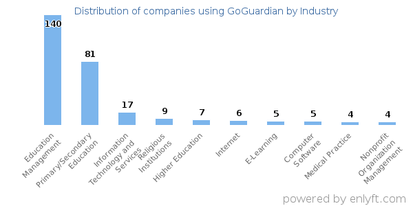 Looking at GoGuardian customers by industry, we find that Education Management (43%), Primary/Secondary Education (25%) and Information Technology and Services (5%) are the largest segments.