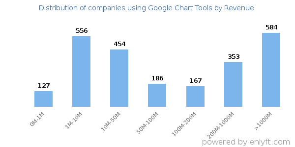 We have data on 2,533 companies that use Google Chart Tools. The companies using Google Chart Tools are most often found in United States and in the Information Technology and Services industry. Google Chart Tools is most often used by companies with 50-200 employees and >1000M dollars in revenue. Our data for Google Chart Tools usage goes back as far as 8 years and 6 months.