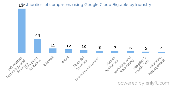 We have data on 318 companies that use Google Cloud Bigtable. The companies using Google Cloud Bigtable are most often found in United States and in the Information Technology and Services industry. Google Cloud Bigtable is most often used by companies with >10000 employees and >1000M dollars in revenue. Our data for Google Cloud Bigtable usage goes back as far as 7 years and 3 months.
