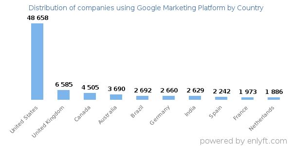 We have data on 103,943 companies that use Google Marketing Platform. The companies using Google Marketing Platform are most often found in United States and in the Retail industry. Google Marketing Platform is most often used by companies with 1-10 employees and 1M-10M dollars in revenue. Our data for Google Marketing Platform usage goes back as far as 6 years and 11 months.