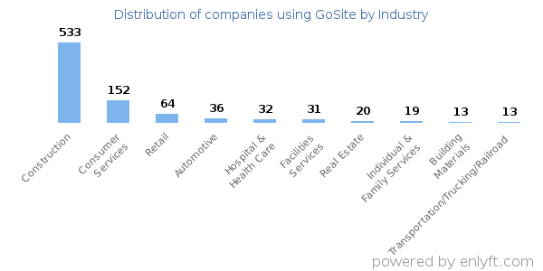 We have data on 1,843 companies that use GoSite. The companies using GoSite are most often found in United States and in the Construction industry. GoSite is most often used by companies with 1-10 employees and 1M-10M dollars in revenue. Our data for GoSite usage goes back as far as 5 years and 2 months.