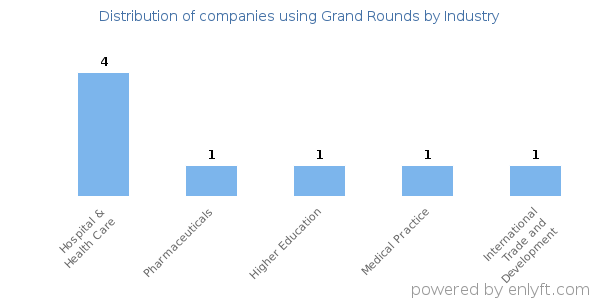 We have data on 8 companies that use Grand Rounds. The companies using Grand Rounds are most often found in United States and in the Hospital & Health Care industry. Grand Rounds is most often used by companies with >10000 employees and >1000M dollars in revenue. Our data for Grand Rounds usage goes back as far as 8 years and 10 months.
