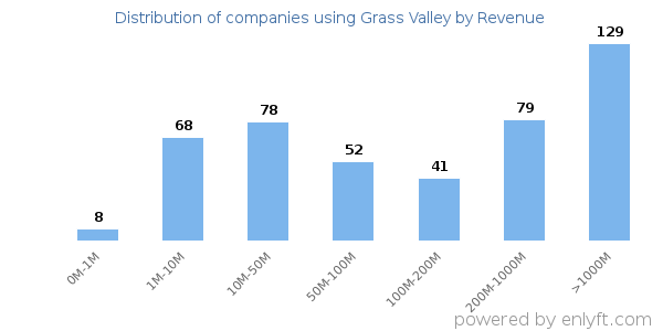 We have data on 481 companies that use Grass Valley. The companies using Grass Valley are most often found in United States and in the Broadcast Media industry. Grass Valley is most often used by companies with 50-200 employees and >1000M dollars in revenue. Our data for Grass Valley usage goes back as far as 9 years and 4 months.