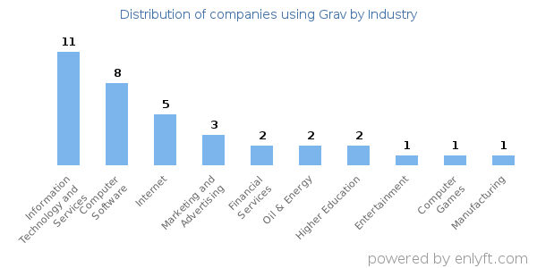 We have data on 48 companies that use Grav. The companies using Grav are most often found in United States and in the Information Technology and Services industry. Grav is most often used by companies with 10-50 employees and 1M-10M dollars in revenue. Our data for Grav usage goes back as far as 3 years and 2 months.