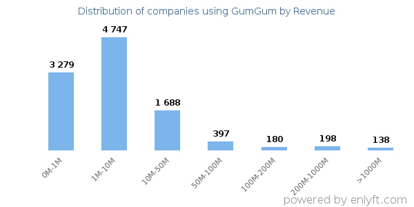 Of all the customers that are using GumGum, a majority (74%) are small (<$50M), 6% are large (>$1000M) and 13% are medium-sized.