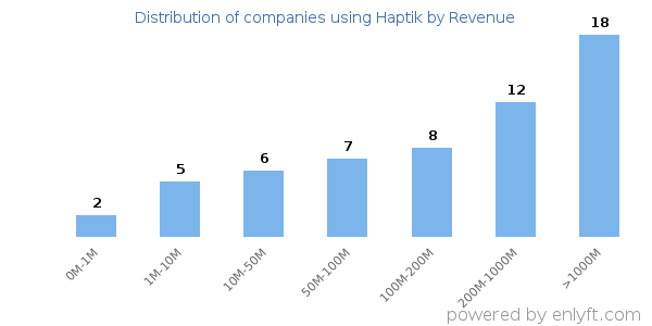 We have data on 59 companies that use Haptik. The companies using Haptik are most often found in India and in the Financial Services industry. Haptik is most often used by companies with 1000-5000 employees and >1000M dollars in revenue. Our data for Haptik usage goes back as far as 1 years and 10 months.