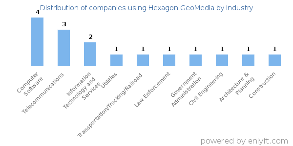 Looking at Hexagon GeoMedia customers by industry, we find that Computer Software (18%), Telecommunications (12%) and Information Technology and Services (6%) are the largest segments.