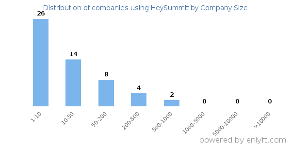 We have data on 96 companies that use HeySummit. The companies using HeySummit are most often found in United States and in the Events Services industry. HeySummit is most often used by companies with 1-10 employees and 1M-10M dollars in revenue. Our data for HeySummit usage goes back as far as 2 years and 7 months.