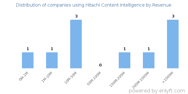 Of all the customers that are using Hitachi Content Intelligence, 22% are small (<$50M), 0% are medium-sized and 22% are large (>$1000M).