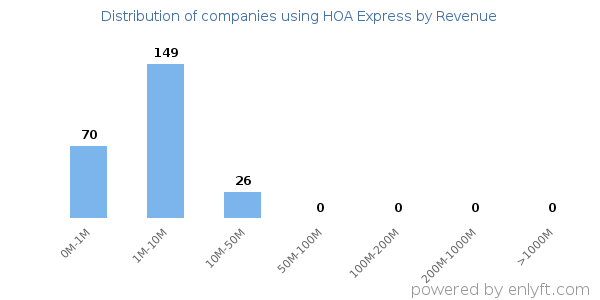 Of all the customers that are using HOA Express, a majority (99%) are small (<$50M), 0% are large (>$1000M) and 0% are medium-sized.
