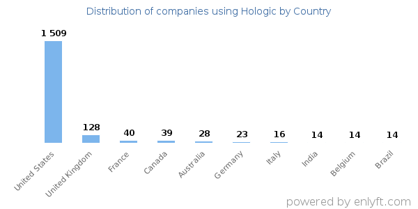 We have data on 2,024 companies that use Hologic. The companies using Hologic are most often found in United States and in the Hospital & Health Care industry. Hologic is most often used by companies with 1000-5000 employees and 200M-1000M dollars in revenue. Our data for Hologic usage goes back as far as 9 years and 4 months.
