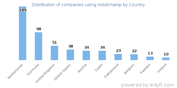 We have data on 671 companies that use Hotelchamp. The companies using Hotelchamp are most often found in Netherlands and in the Hospitality industry. Hotelchamp is most often used by companies with 50-200 employees and 1M-10M dollars in revenue. Our data for Hotelchamp usage goes back as far as 5 years and 2 months.