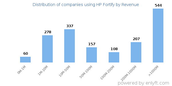 We have data on 1,751 companies that use HP Fortify. The companies using HP Fortify are most often found in United States and in the Information Technology and Services industry. HP Fortify is most often used by companies with >10000 employees and >1000M dollars in revenue. Our data for HP Fortify usage goes back as far as 9 years and 10 months.