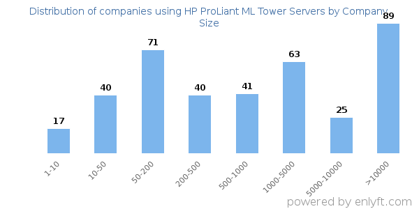 We have data on 389 companies that use HP ProLiant ML Tower Servers. The companies using HP ProLiant ML Tower Servers are most often found in United States and in the Information Technology and Services industry. HP ProLiant ML Tower Servers is most often used by companies with >10000 employees and >1000M dollars in revenue. Our data for HP ProLiant ML Tower Servers usage goes back as far as 9 years and 7 months.