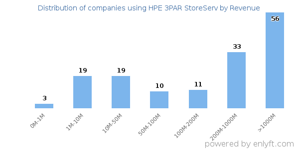 We have data on 157 companies that use HPE 3PAR StoreServ. The companies using HPE 3PAR StoreServ are most often found in United States and in the Information Technology and Services industry. HPE 3PAR StoreServ is most often used by companies with >10000 employees and >1000M dollars in revenue. Our data for HPE 3PAR StoreServ usage goes back as far as 2 years and 9 months.
