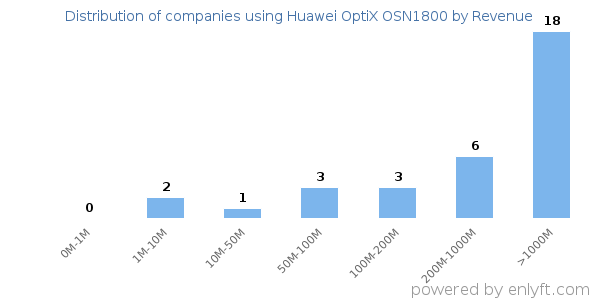 Of all the customers that are using Huawei OptiX OSN1800, a majority (65%) are large (>$1000M), 0% are small (<$50M) and 12% are medium-sized.