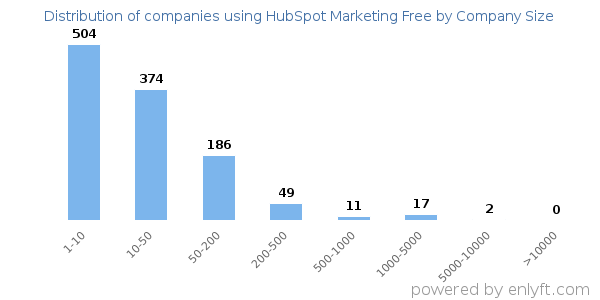 We have data on 1,230 companies that use HubSpot Marketing Free. The companies using HubSpot Marketing Free are most often found in United States and in the Marketing and Advertising industry. HubSpot Marketing Free is most often used by companies with 1-10 employees and 1M-10M dollars in revenue. Our data for HubSpot Marketing Free usage goes back as far as 9 years.