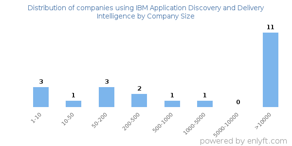 We have data on 26 companies that use IBM Application Discovery and Delivery Intelligence. The companies using IBM Application Discovery and Delivery Intelligence are most often found in United States and in the Information Technology and Services industry. IBM Application Discovery and Delivery Intelligence is most often used by companies with >10000 employees and >1000M dollars in revenue. Our data for IBM Application Discovery and Delivery Intelligence usage goes back as far as 5 years and 2 months.
