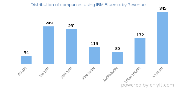 We have data on 1,302 companies that use IBM Bluemix. The companies using IBM Bluemix are most often found in United States and in the Information Technology and Services industry. IBM Bluemix is most often used by companies with >10000 employees and >1000M dollars in revenue. Our data for IBM Bluemix usage goes back as far as 8 years and 11 months.