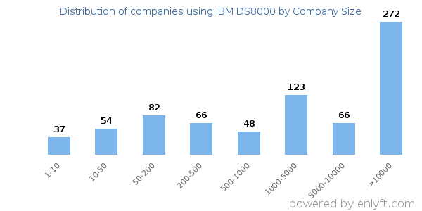 We have data on 760 companies that use IBM DS8000. The companies using IBM DS8000 are most often found in United States and in the Information Technology and Services industry. IBM DS8000 is most often used by companies with >10000 employees and >1000M dollars in revenue. Our data for IBM DS8000 usage goes back as far as 9 years and 7 months.