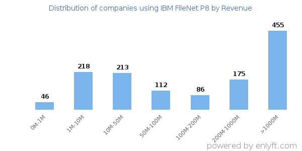 We have data on 1,368 companies that use IBM FileNet P8. The companies using IBM FileNet P8 are most often found in United States and in the Information Technology and Services industry. IBM FileNet P8 is most often used by companies with >10000 employees and >1000M dollars in revenue. Our data for IBM FileNet P8 usage goes back as far as 10 years and 2 months.