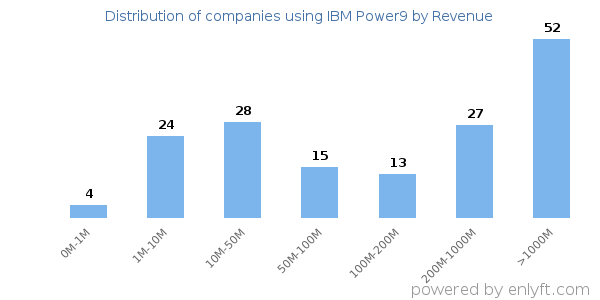 We have data on 167 companies that use IBM Power9. The companies using IBM Power9 are most often found in United States and in the Information Technology and Services industry. IBM Power9 is most often used by companies with >10000 employees and >1000M dollars in revenue. Our data for IBM Power9 usage goes back as far as 3 years and 10 months.