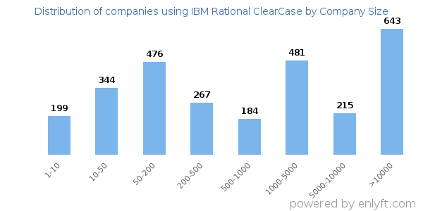We have data on 2,861 companies that use IBM Rational ClearCase. The companies using IBM Rational ClearCase are most often found in United States and in the Information Technology and Services industry. IBM Rational ClearCase is most often used by companies with >10000 employees and >1000M dollars in revenue. Our data for IBM Rational ClearCase usage goes back as far as 10 years and 2 months.