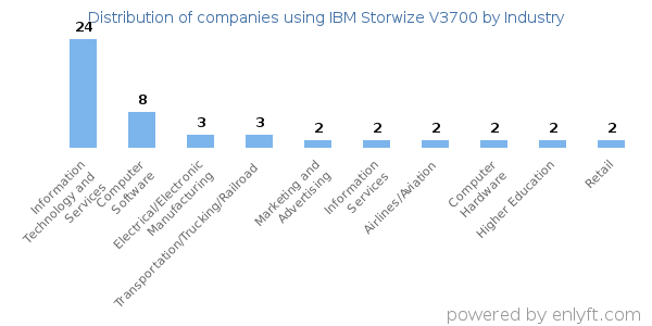 We have data on 83 companies that use IBM Storwize V3700. The companies using IBM Storwize V3700 are most often found in United States and in the Information Technology and Services industry. IBM Storwize V3700 is most often used by companies with >10000 employees and 10M-50M dollars in revenue. Our data for IBM Storwize V3700 usage goes back as far as 2 years and 9 months.