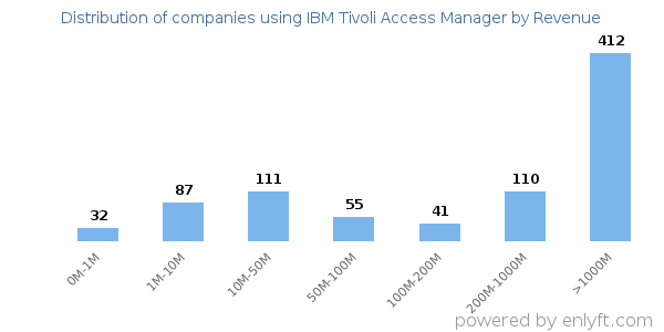 Of all the customers that are using IBM Tivoli Access Manager, a majority (60%) are large (>$1000M), 23% are small (<$50M) and 12% are medium-sized.