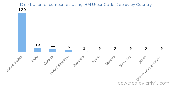 We have data on 174 companies that use IBM UrbanCode Deploy. The companies using IBM UrbanCode Deploy are most often found in United States and in the Information Technology and Services industry. IBM UrbanCode Deploy is most often used by companies with >10000 employees and >1000M dollars in revenue. Our data for IBM UrbanCode Deploy usage goes back as far as 5 years and 2 months.