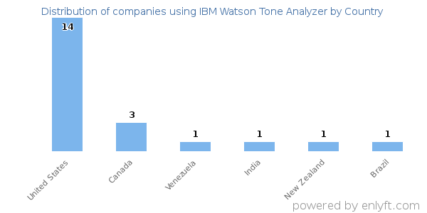 We have data on 21 companies that use IBM Watson Tone Analyzer. The companies using IBM Watson Tone Analyzer are most often found in United States and in the Higher Education industry. IBM Watson Tone Analyzer is most often used by companies with 1000-5000 employees and 200M-1000M dollars in revenue. Our data for IBM Watson Tone Analyzer usage goes back as far as 5 years and 11 months.
