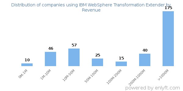 We have data on 393 companies that use IBM WebSphere Transformation Extender. The companies using IBM WebSphere Transformation Extender are most often found in United States and in the Information Technology and Services industry. IBM WebSphere Transformation Extender is most often used by companies with >10000 employees and >1000M dollars in revenue. Our data for IBM WebSphere Transformation Extender usage goes back as far as 10 years and 1 months.