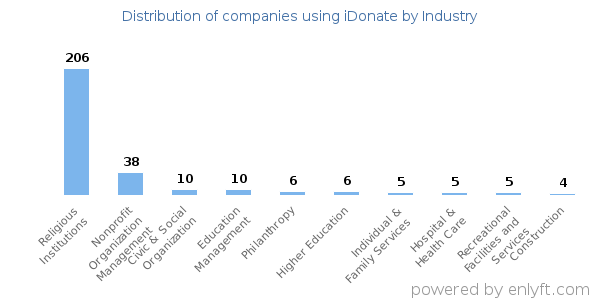 We have data on 427 companies that use iDonate. The companies using iDonate are most often found in United States and in the Religious Institutions industry. iDonate is most often used by companies with 1-10 employees and 1M-10M dollars in revenue. Our data for iDonate usage goes back as far as 5 years and 2 months.