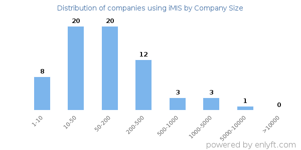 We have data on 70 companies that use iMIS. The companies using iMIS are most often found in United States and in the Nonprofit Organization Management industry. iMIS is most often used by companies with 50-200 employees and 1M-10M dollars in revenue. Our data for iMIS usage goes back as far as 3 years and 4 months.