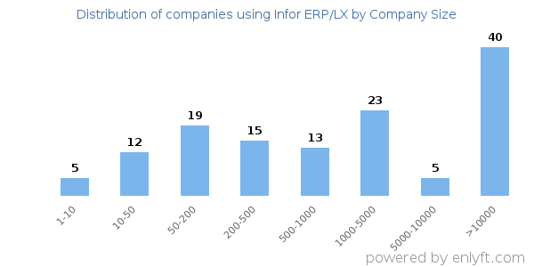 We have data on 134 companies that use Infor ERP/LX. The companies using Infor ERP/LX are most often found in United States and in the Information Technology and Services industry. Infor ERP/LX is most often used by companies with >10000 employees and >1000M dollars in revenue. Our data for Infor ERP/LX usage goes back as far as 8 years and 5 months.