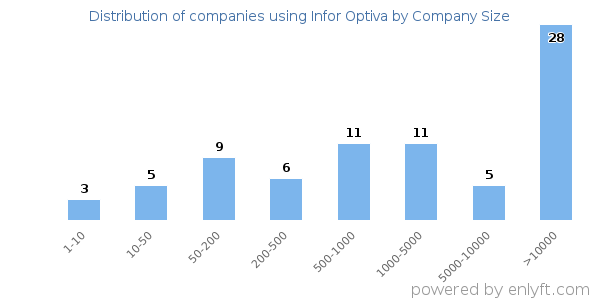 Of all the customers that are using Infor Optiva, a majority (53%) are large (>1000 employees), 8% are small (<50 employees) and 30% are medium-sized.