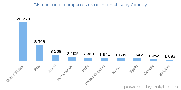 We have data on 55,759 companies that use Informatica. The companies using Informatica are most often found in United States and in the Information Technology and Services industry. Informatica is most often used by companies with 50-200 employees and 1M-10M dollars in revenue. Our data for Informatica usage goes back as far as 10 years and 6 months.
